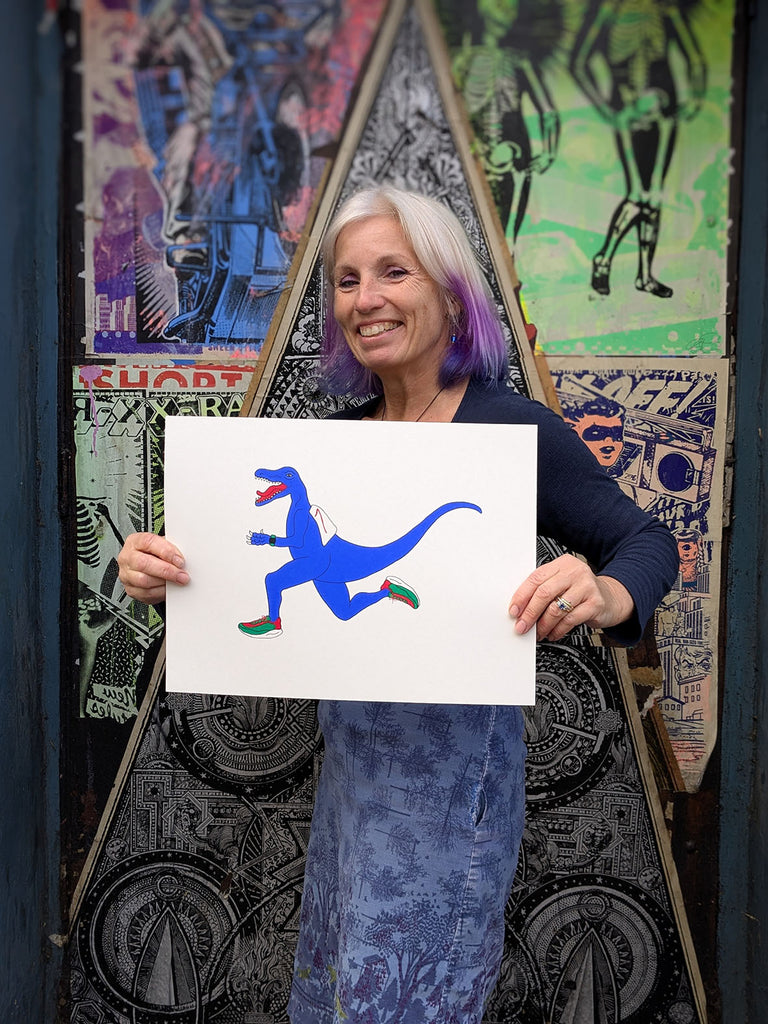 Liz holding a Print of a Blue dinosaur with red and green shoes